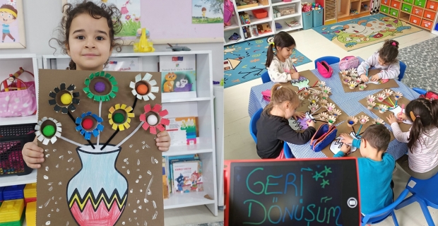 Minik öğrenciler, hayal güçlerini kullanarak geri dönüşüm malzemelerini boyadı, yapıştırdı ve birbirinden renkli sanat eserleri ortaya çıkardı. Etkinlik süresince çocukların el becerileri, yaratıcılıkları ve ince motor gelişimleri desteklenirken, atık olarak görülen materyallerin yeniden kullanılabileceği farkındalığı kazandırıldı.