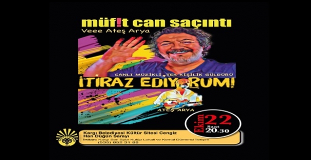 Mandıra Filozofu lakabıyla ünlenen, ünlü oyuncu Müfit Can Saçıntı 22 Ekim’de Kargı’da ‘’İtiraz Ediyorum’’ adlı tiyatro oyununu sergileyecek.