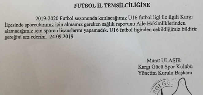 Geçtiğimiz hafta ilçede gündeme gelen Kargı Gücü sporcularına ilçedeki aile hekimleri tarafından sağlık raporu verilmediği iddiaları konuşulurken Kargı Gücü spor Kulübü’nden bugün yapılan açıklamayla kulübün sağlık raporu nedeniyle ligden çekildiğini bildirildi.