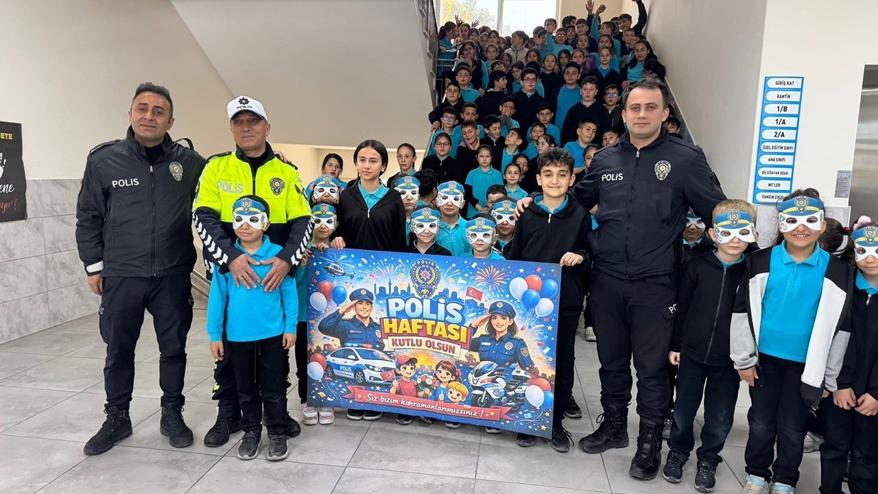 Okul polislerini okula davet eden öğrenciler, koridorda açtıkları “Siz bizim kahramanlarımızsınız, Polis Haftası kutlu olsun” yazılı pankart ve alkışlarla polisleri karşıladı.